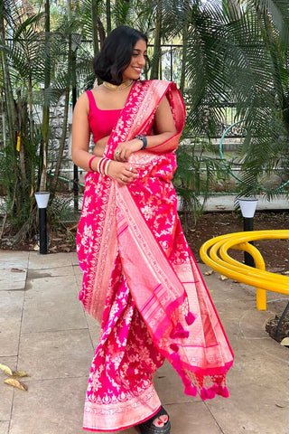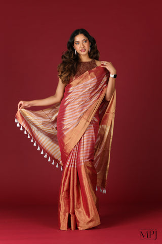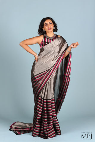 View allSilver and Black/Pink Striped Tissue Silk Chanderi Saree with Stitched Blouse