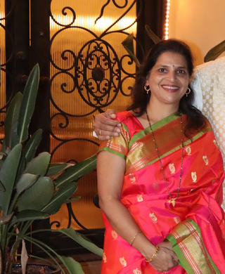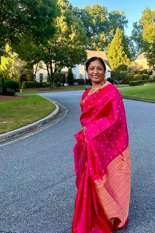"I bought a beautiful pink Paithani for a wedding reception. I went to Monika’s home studio and she helped me select this saree. The silk, the texture and color, everything is perfect. I always get lots of compliments for its beautiful color!!– Anagha from Carrollton